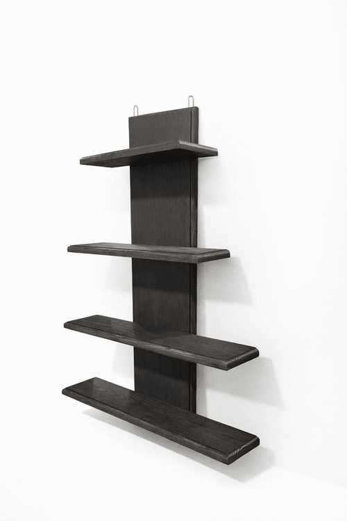 Мінімалістична настінна полиця з темного дерева, створена для сучасних інтер’єрів. Її вертикальна опора та рівні горизонтальні лінії підкреслюють гармонію й баланс, а плавні краї додають витонченості. Полиця легко монтується завдяки надійним металевим кріпленням і стане стильним акцентом у будь-якій кімнаті — від вітальні до робочого кабінету.