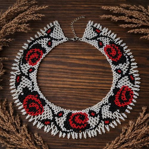 У кожній намистині — подих традиції, у кожній троянді — відлуння української землі. Червоні квіти розквітають на білому мереживі, обрамлені чорним орнаментом, мов пісня, що зберігає пам’ять поколінь. Сережки ніжно повторюють мотиви намиста, створюючи гармонійний ансамбль, який звучить як єдина мелодія.